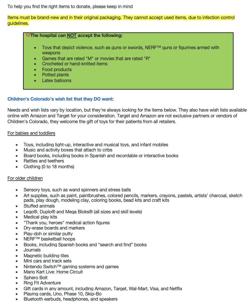 We will be meeting at the King Soopers on Colfax and Chambers at 10am. While there, we will load the toys into a few vehicles and head over to the hospital. Once at the hospital, we will line up for a short parade lap around the hospital ending in the front where the vehicle(s) with the toys will drop them off to awaiting hospital staff.