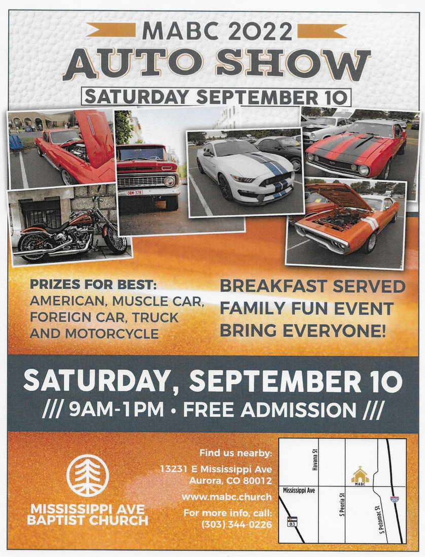 Mississippi Avenue Baptist Church will be having their 9th annual car show on Saturday, September 10th. There will be a free breakfast and car show starting at 9:00 AM and lasting until 1:00 PM. Awards will be given for the best vehicles in the following categories: American, muscle and foreign cars as well as truck and motorcycle. The church is located at 13231 E. Mississippi Avenue in Aurora two blocks west of I-225. So stop by for breakfast and show off your car.