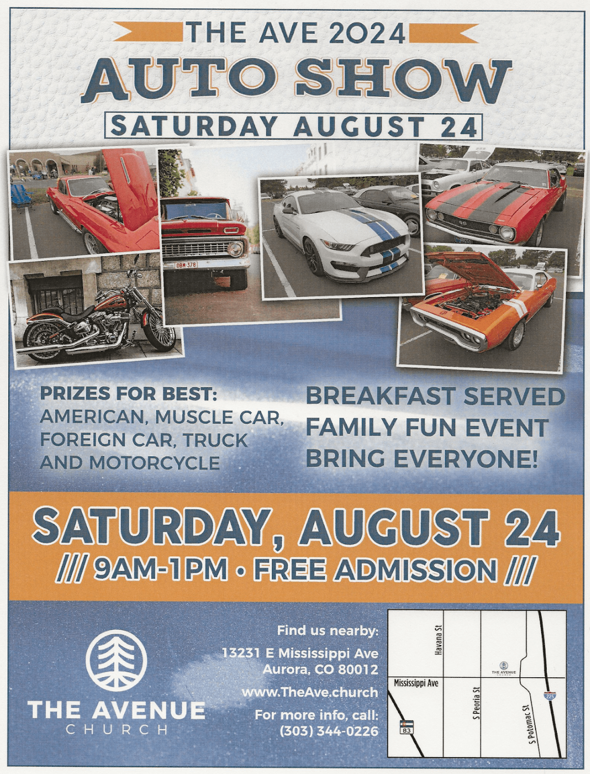 blocks west of I-225. So, stop by for breakfast and show off your car. It’s a family fun