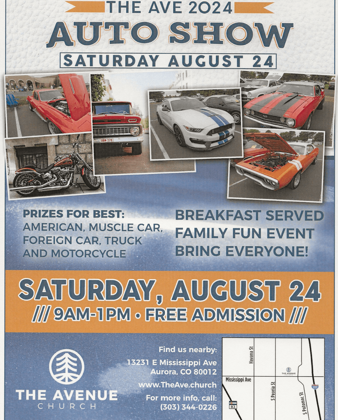 MABC Car Show 2024 Where: Mississippi Ave. Baptist Church at 13231 E. Mississippi Avenue, Aurora, CO Date: Saturday, August 24th Time: 9am-1pm Cost: Free ZCCC Host: Andy Mortenson The Avenue Church (formerly called Mississippi Avenue Baptist Church) will be having their 10th annual car show on Saturday, August 24th. …